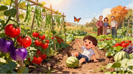 童孙垄上追蝶影,误踏瓜球。跌坐田头,尽惹家人笑不休。