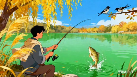 垂钓挑杆鳞跳跃,金风扑面扯衣衫。