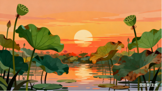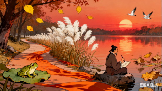 湖边小路静幽幽,霞光铺锦绸。青蛙谢客闭歌喉,芦花扬起头。