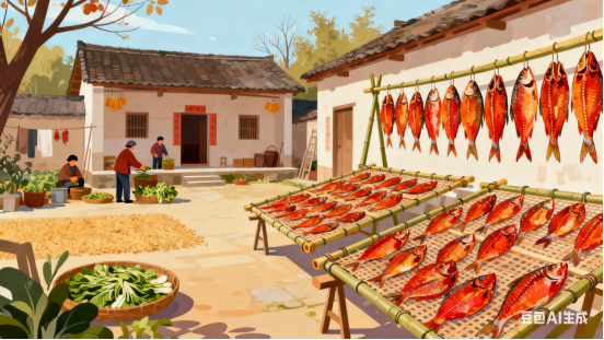 干菜晒,亮魚坯,冬日食材当富余。农户人家思远虑,小康日子倍珍惜。