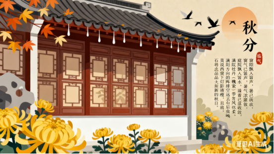 桂影摇窗,风送新凉。正云淡、天抹斜阳。枫燃赤焰,稻涌金浪。恰雁成行,蝉声断,藕丝长。