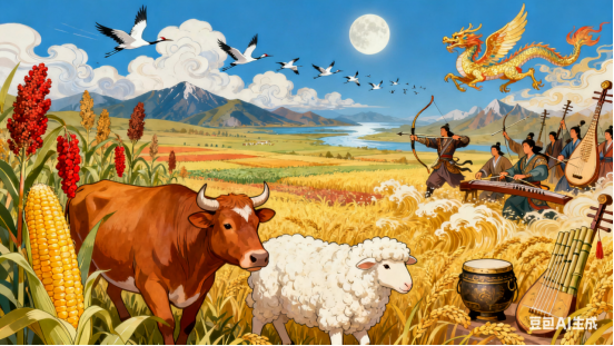 草原千里清秋半,牛壮羊肥时候。云舒云卷,山高水远, 鹤飞龙走。玉米酣醺,高粱明酽, 宝山罗绣。雁南声过也, 翻金稻浪,洪波起,频敲缶。