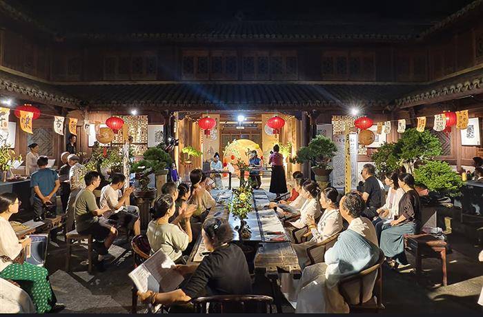 牛郎织女徜徉,琴笛起铭园飞凤凰。雅颂无穷乐,传承国粹;舜尧贺彩,翁媪鸳鸯。出水芙蓉,笑声扬溢,岁月琼楼技艺庞。锦瑟梦,饮下清雅液,永乐畲乡。