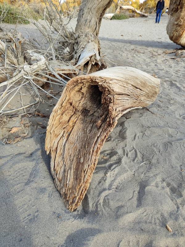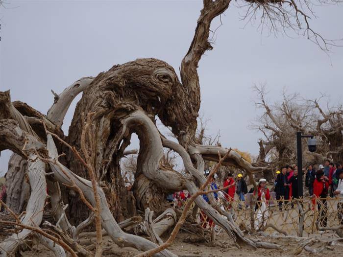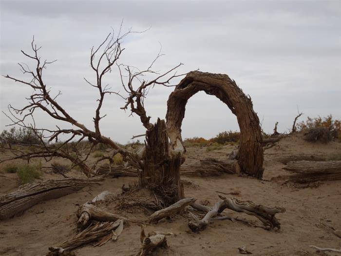 陨之神木,体态优扬。傲骨凌月,凋亦昂首拄天宇。忠魂贯日,谢犹挺胸撑厚壤。望鸽飞鸿度,牵丝路驼铃远。喜风清沙静,慰商旅古道长。千载伫立,盼春信归故土。一生守望,待来者话沧桑。或疏或密,如军阵有序布天罡。或弯而成趣,似雄鸡破晓迎曙光。或直或圆,圆似长河落日,直若大漠孤烟。生为戍边战士,守土安疆承大义。陨为护国英魂,保邦靖域铸担当。