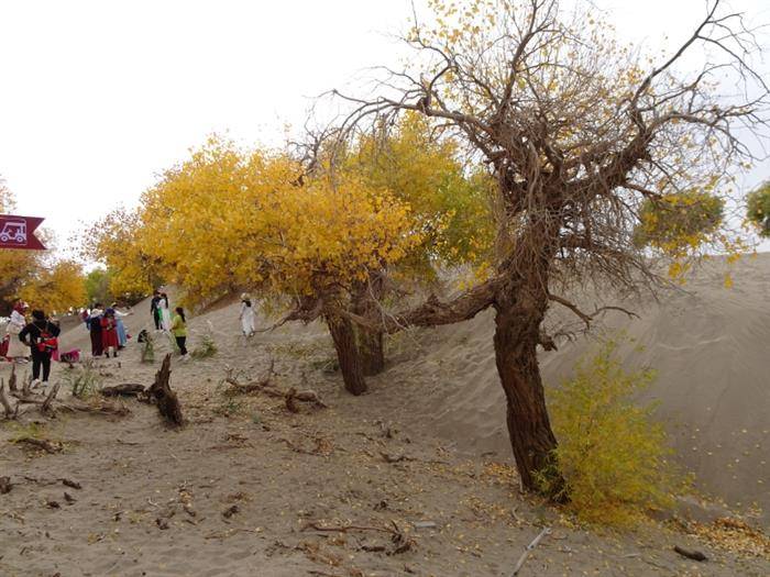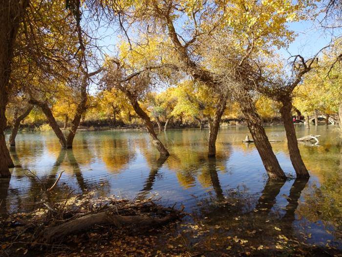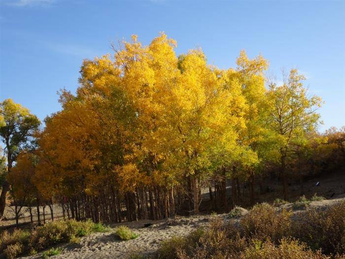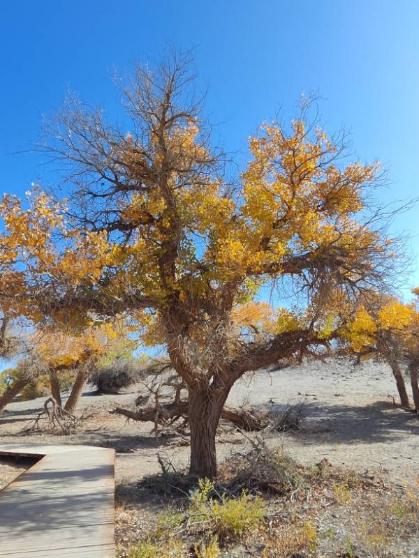 乙巳仲秋,天澄宇朗。十万银龄,专列北上。放眼处,沙海万株胡杨挺,曲水千亩树影黄。风过时,满眼金涛迎日舞,一湖彩浪顺风扬。惊大漠神木韵,品千年侠骨香。