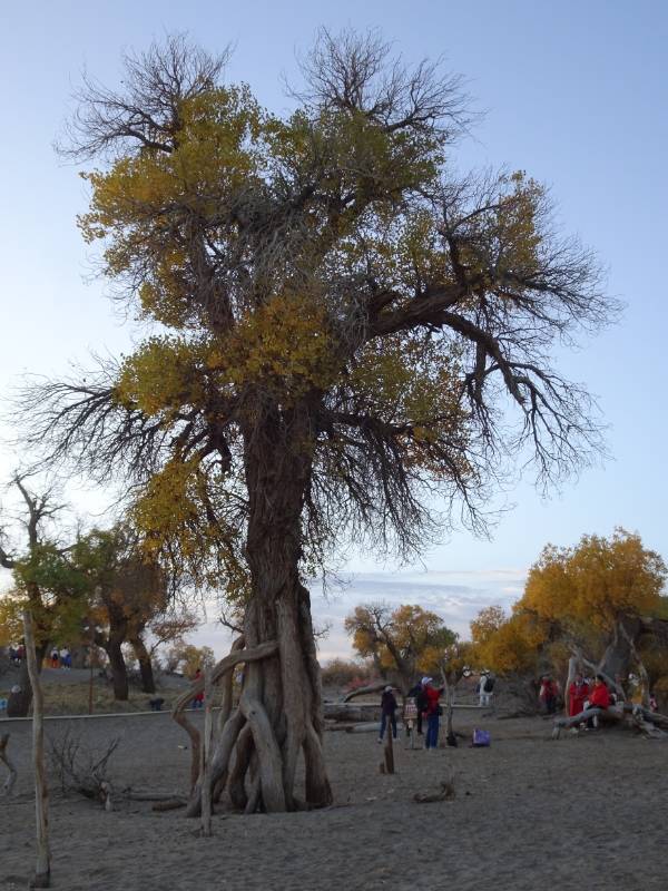近观胡杨,枝向八荒,舒如宝剑指远处。叶覆四野,叠若巨伞蔽炎凉。揽朝暮之清辉,沐时空之暖阳。风来枝叶纵横如铁壁,沙起躯干密布似铜墙。岁月打磨,老皮皴裂如鳞甲,深纹粗糙似精钢。斯树也,寿逾千年。汲露餐霜,砺百折不挠之志。遮风固沙,护一方康宁吉祥。实乃大漠之魂,戈壁之魄,塞北之金汤。