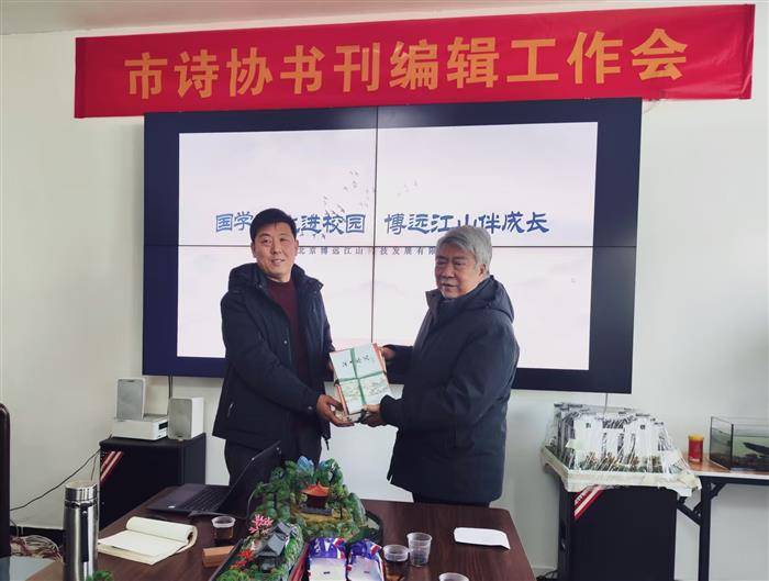首先,博远江山公司董事长朱利波致欢迎辞,并详细介绍了企业发展历程、产业布局及文化建设理念,强调企业始终重视本土文化传承,此次能为《太行壮歌》编辑工作提供支持深感荣幸,愿以诗企携手为诗词事业发展添砖加瓦。随后,韩存锁代表市诗协向博远江山公司赠送了《汗牛诗选》《柏坡风》等图书刊物。