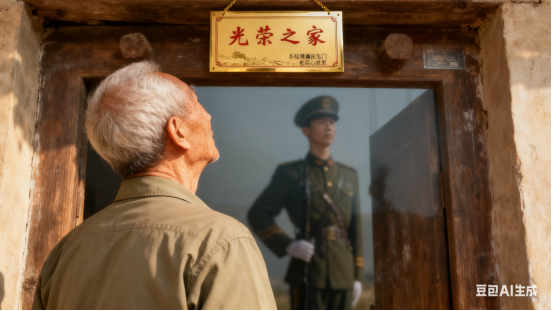 手抚牌匾挂宅门,老兵心感恩。回眸军旅献青春,边关热血殷。
