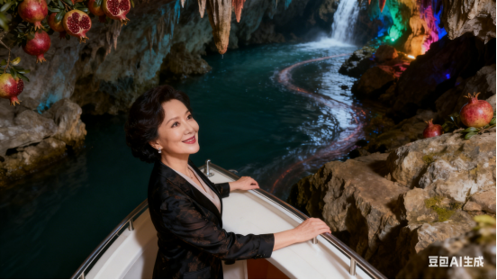 世上奇观,水洞蜿蜒。耀霓虹、五彩斑斓。顶垂石榴,姿态万端。见湍急水,飞泠瀑,耸巉岩。