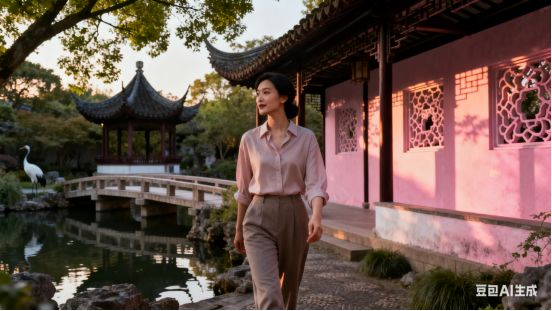 树阴凉,湖寂静。水榭玲珑,桥小通幽径。中式长廊诗意涌,窗镂夕晖,粉壁波光映。