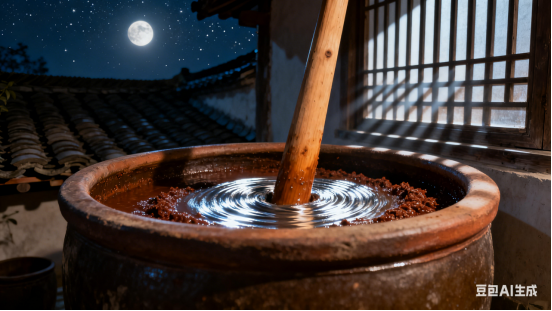 木柄直垂探酱缸,晨昏往复韵悠长。三翻沉淀春秋味,四捣调和岁月香。