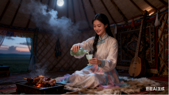 围壁藏春笑语饶,弦绕椽杆,魂寄毡包。醇浆凝玉炙香遥 ,歌漫苍原,归梦如潮。