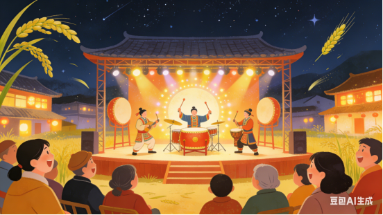 初闻鼓点铿锵,再听歌赋激扬。近看舞台灯火,戏说致富华章。