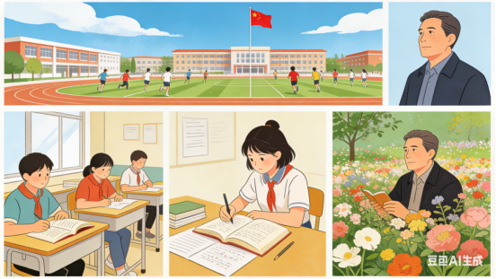 书声朗朗悠长,摘抄笔录匆忙。唯有先生不语,沉迷花海馨香。