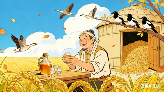 枝头喜鹊喧声,粮仓储满双赢。老酒千杯不醉,来年巨产丰登。