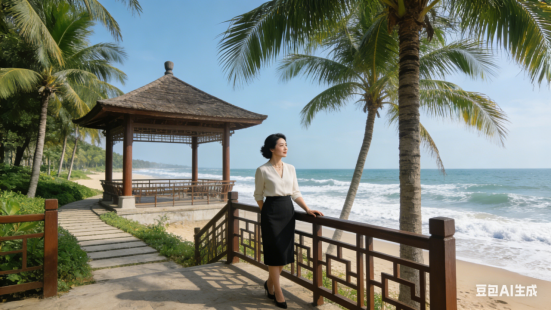 银滩逐浪观潮,亭栏闲倚听涛。最爱椰鸡佐酒,醉里踏月逍遥。