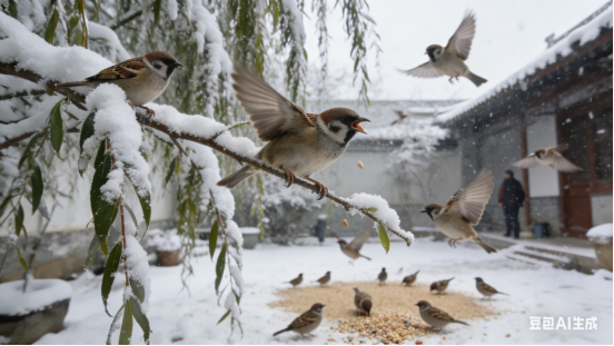 北风冽冽,院柳盈寒雪。取景枝头拍特写,闯进觅食麻雀。