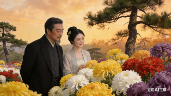 深秋菊苑,携侣争相看。满眼黄白红紫绽,松柏迎风赞叹。