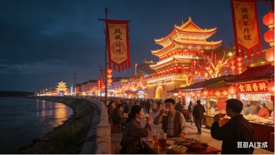 蒿城夜色,璀璨灯光射。街路游人多食客,亲友聚餐静默。