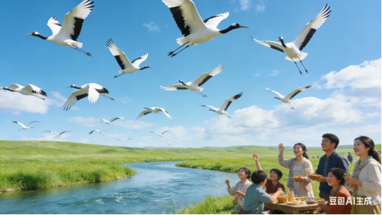 蓝天飞鹤,江水何清澈。牧野青青诚广阔,笑脸盈盈好客。