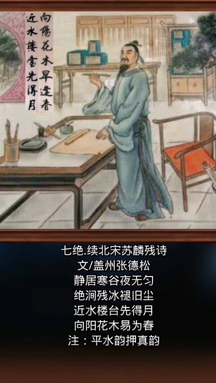 苏麟是北宋官员,杭州属县巡检,官职不大。这首诗的背景是,范仲淹在杭州当官,对部下很宽厚,常举荐随员做官!然而,苏麟因为在外办事,所以没有得到举荐。为此,苏麟感慨万千,写下了这首残诗! 虽说是残诗,名气却很大,可谓是千古流传。云:“近水楼台先得月,向阳花木易为春。”实则暗指:靠近范仲淹的,都得了好处。范仲淹看到这首残诗之后,很快就写了封推荐信,使苏麟得到升迁。后来成为讥讽利用职务之便捞好处的人!